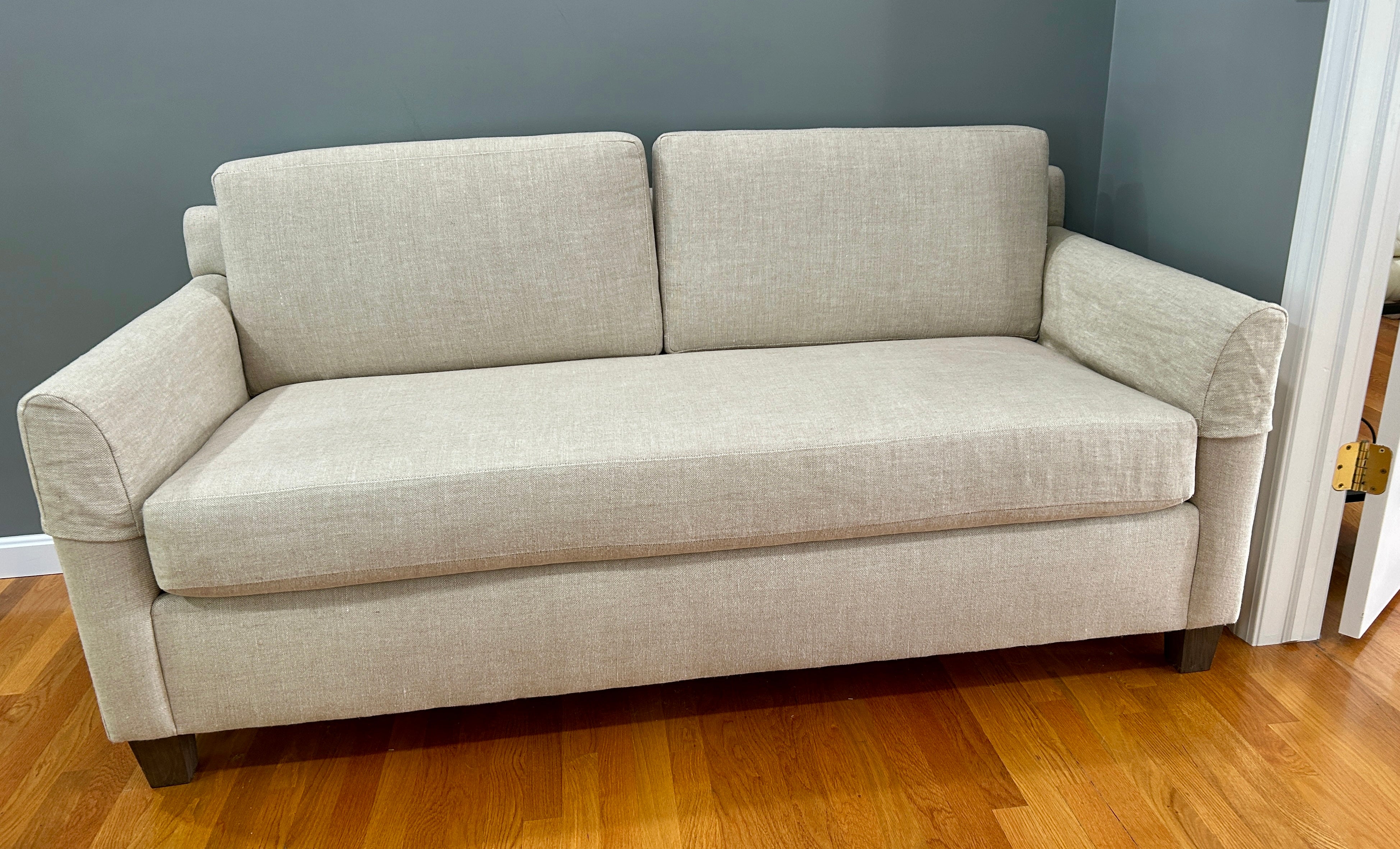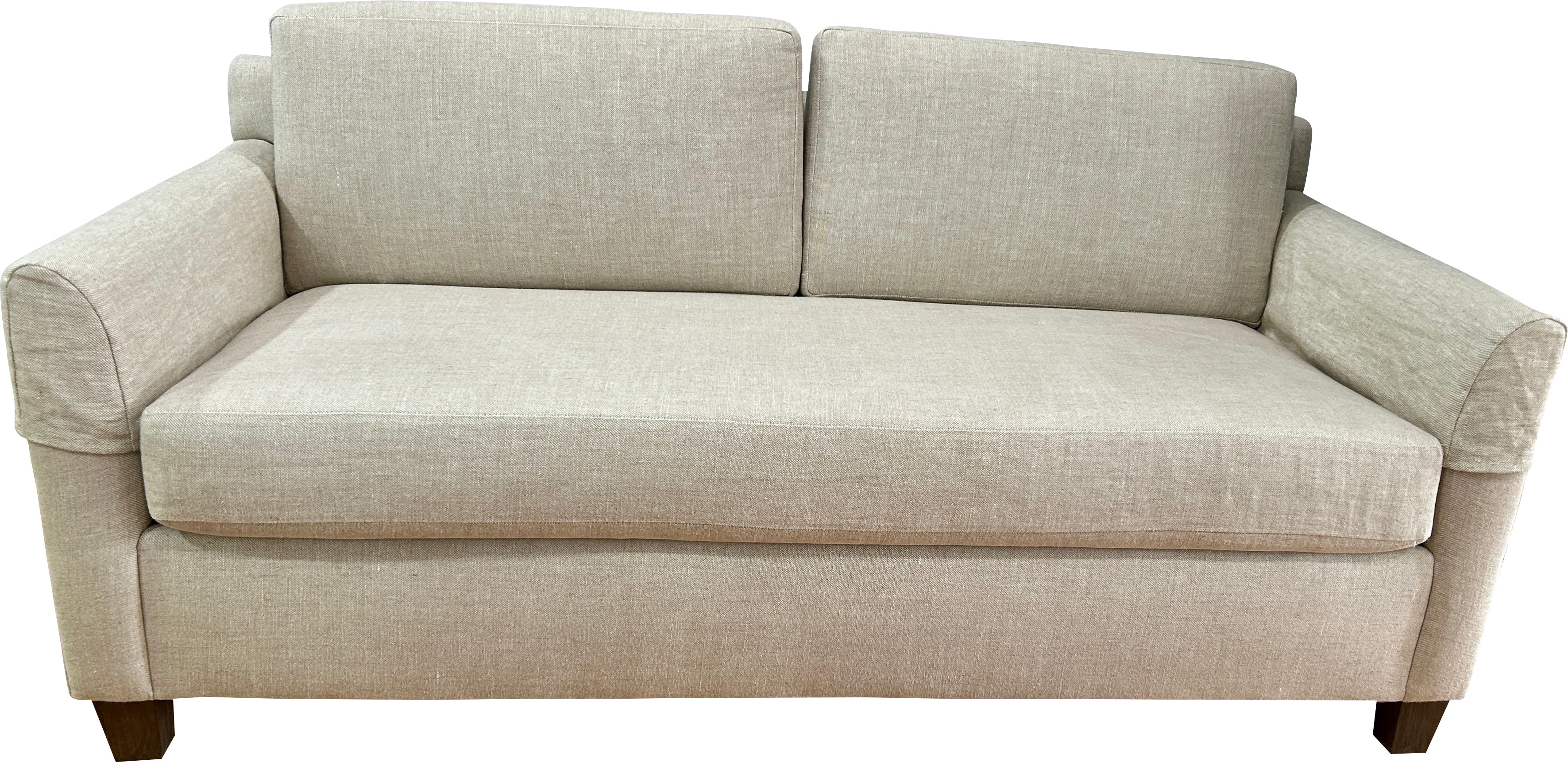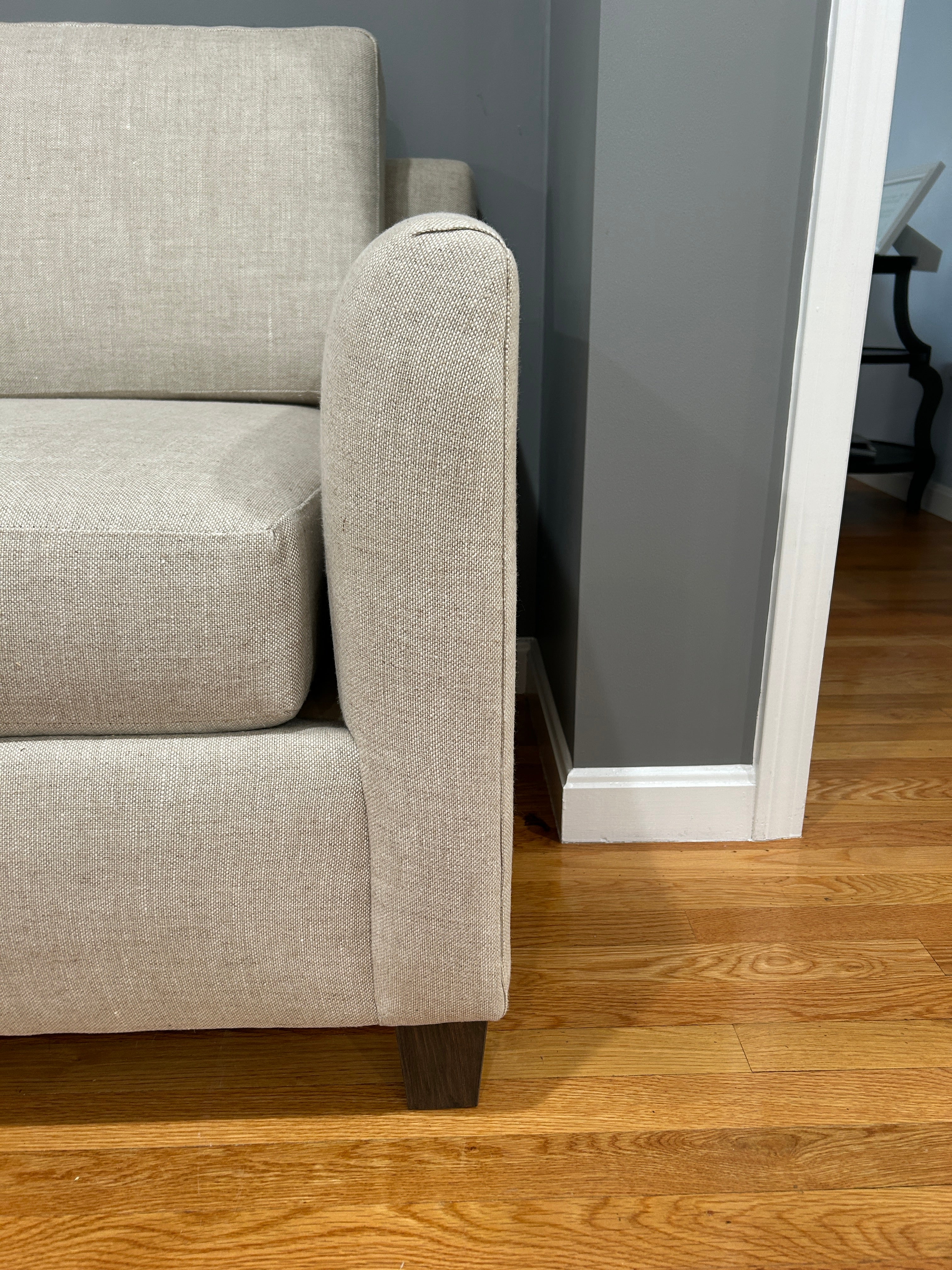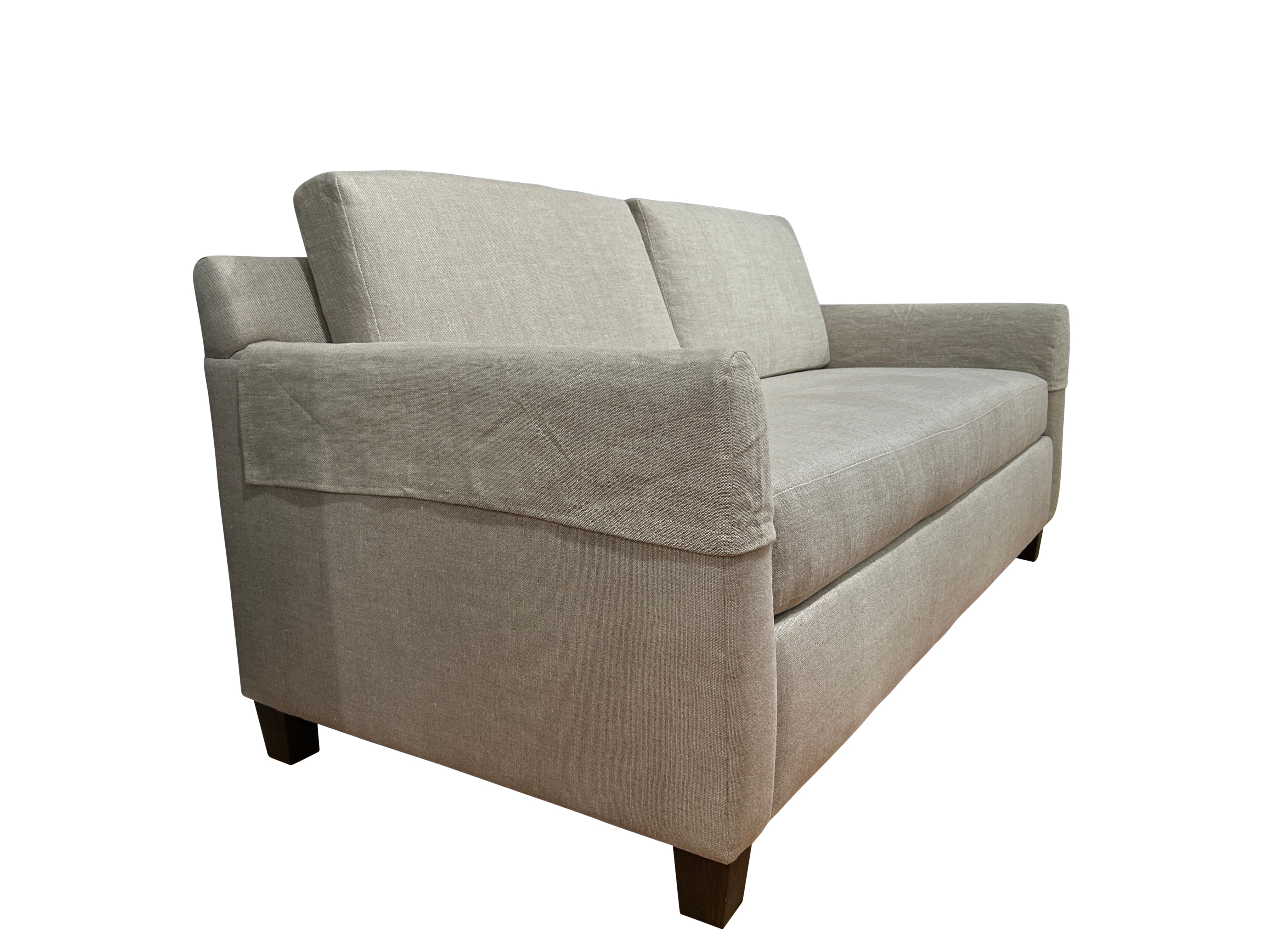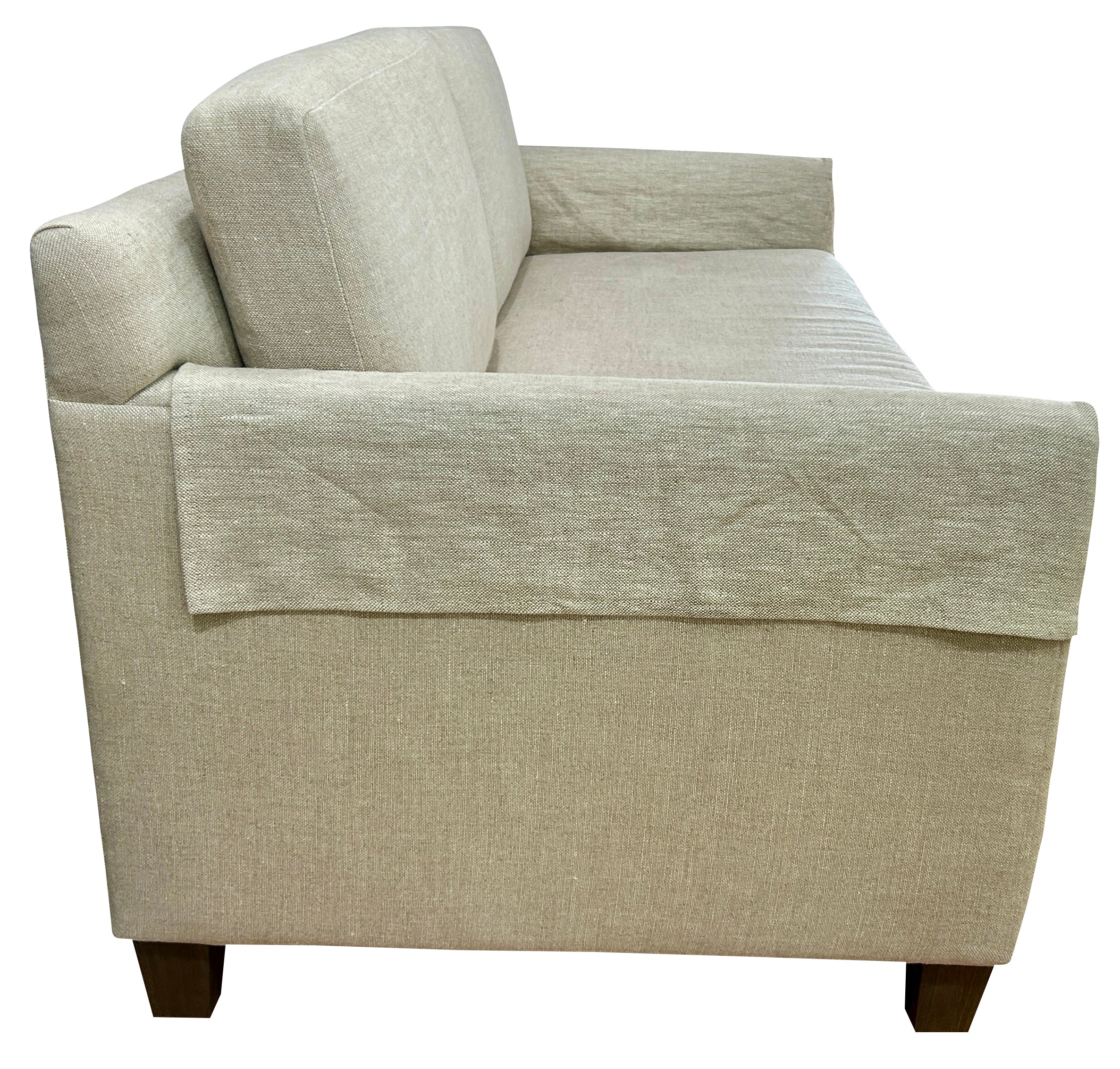 • This slightly curved track arm organic sofa works with designs aesthetics. It is quite comfortable with its loose back and seat cushions. Cushion covers have back hidden zippers so that they can be removed for cleaning.  Ottoman is available and sold separately. The 72" sofa is 72″W x 34″D x 34″H. The larger sofa is 84″W. Seat height 18". Inside seat depth 22.5". Arm height 25”. Arm width 4".  This sofa can be made in any length with any number of seat and back cushions. Made in the USA. This sofa is shown in Two Sisters Ecotextiles Salish Dappled untreated Belgian linen. Arm covers can be purchased separately under accessories.